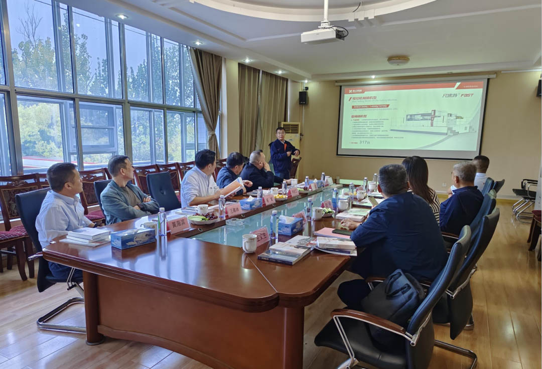 參觀結(jié)束,技術(shù)總監(jiān)姜新波為考察團(tuán)介紹了信川平壓平家族的新產(chǎn)品、明星機(jī)型、暢銷機(jī)型等設(shè)備的特點(diǎn)和信川聯(lián)動(dòng)線的相關(guān)情況,邊瑜總經(jīng)理介紹了公司發(fā)展情況。